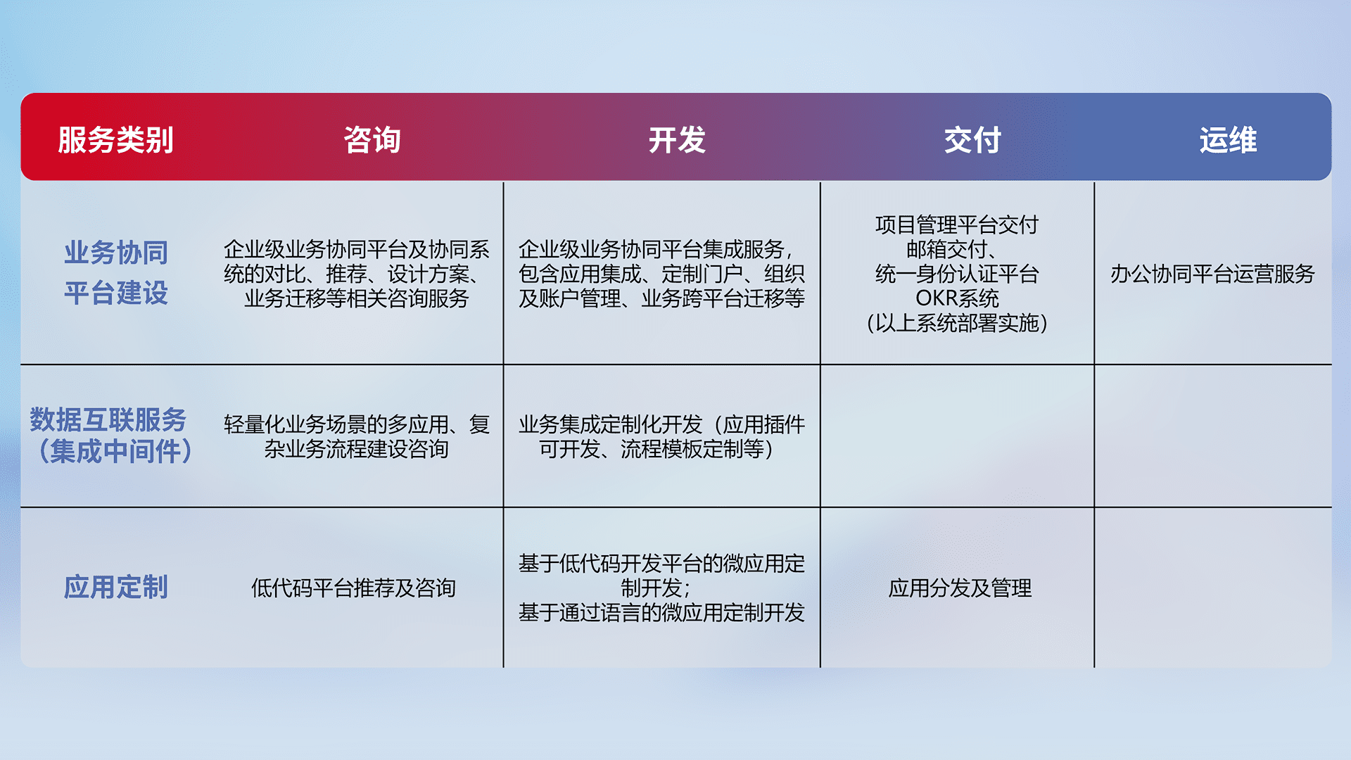 针对钉钉、、、企微、、、、IDaas等平台级产品提供产品的规划、、方案、、、交付、、、、定制化开发等服务,,实现如统一协同办公、、、智能客户服务、、、、混合会议管理、、智能数据查询、、等业务场景,,,实现数字化转型。。。。