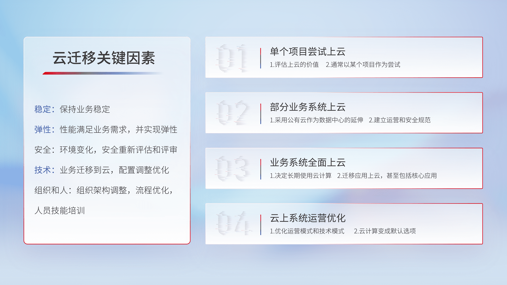 结合实际业务,,从规划设计、、、、云平台选型、、、、云原生改造、、数据迁移、、、集成交付,,,迁移全过程为客户识别最佳上云路径,,,,做好风险识别管理,,,设计网络架构、、、、身份权限、、、安全审计合规、、操作审计、、日志审计、、、监控告警策略、、、、多站点容灾设计等,,,,对云上基础设施进行整体规划,,,提升IT治理水平,,,以满足弹性、、、高可用、、、高性能的需求。。